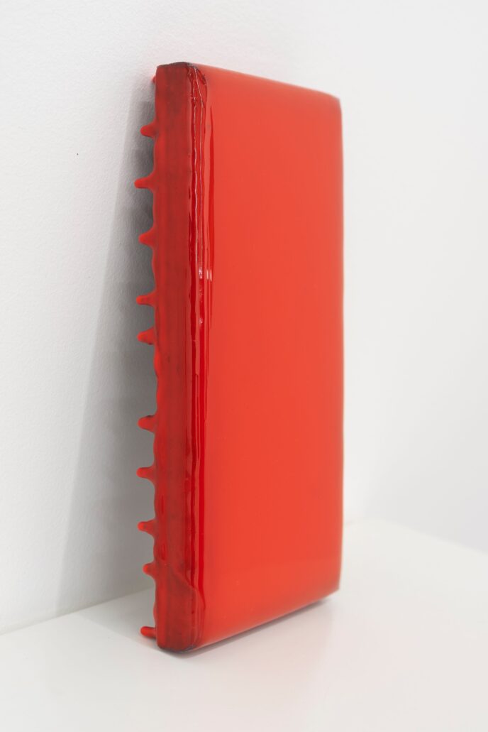 ‘Johl Dwyer’s artworks are created from plaster and cedar [and resin]. They are set into forms recognisable as paintings in a making process through which the artist assays pictorial space as well as the grammar of painting itself. Creating a tension between surface plane and physical depth, between image and materiality, between practice and artwork, Dwyer addresses ‘frame’ not as method for composing an image but as the edge of an object, replaces the thin layer of canvas with dense, active substrate, and integrates colour into the structure of the work rather than simply applying it. Each of these is a formal gesture in exploring the definition of his chosen medium.