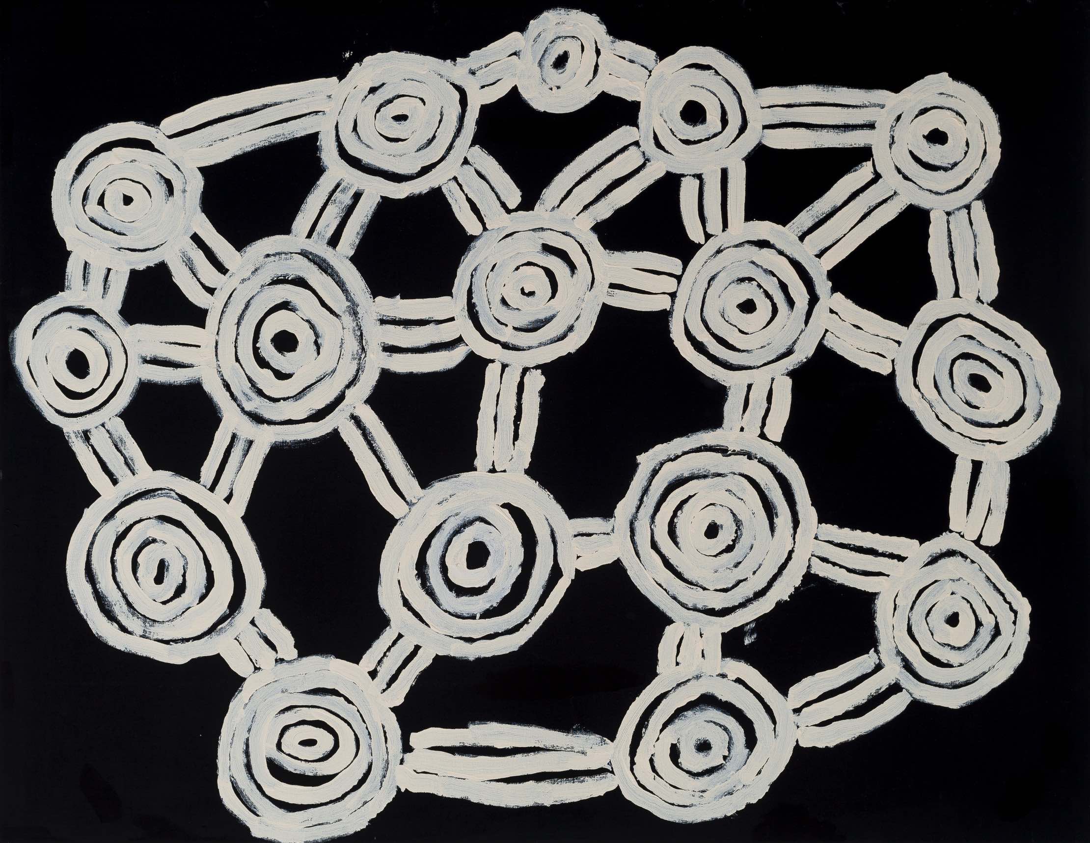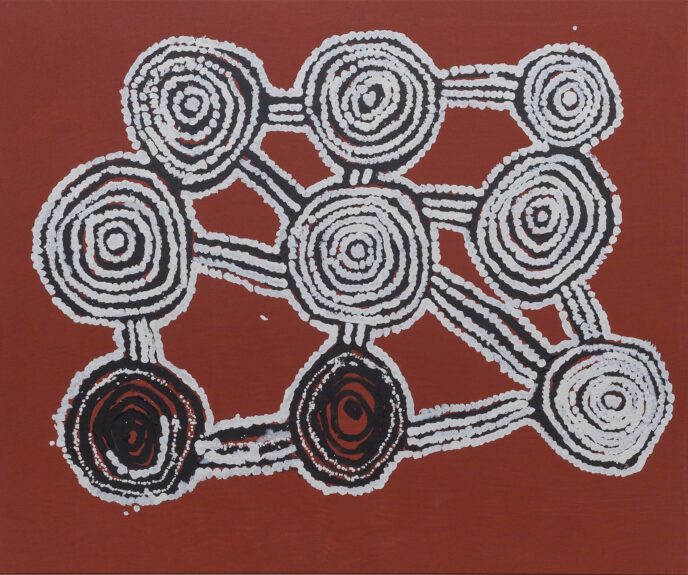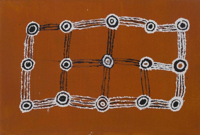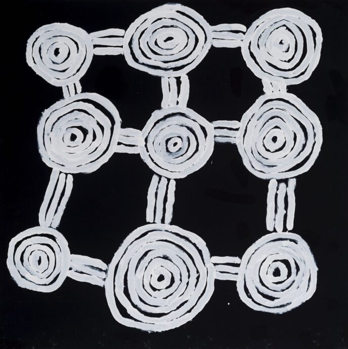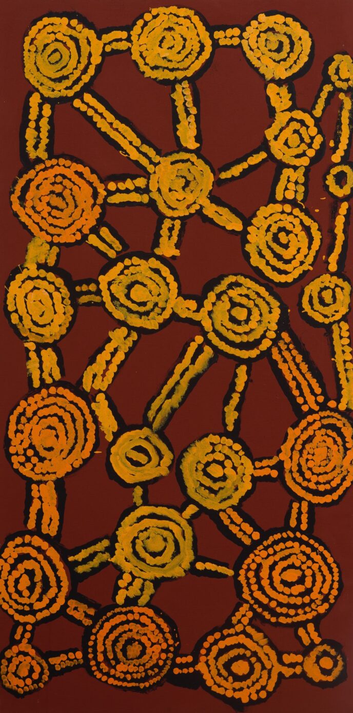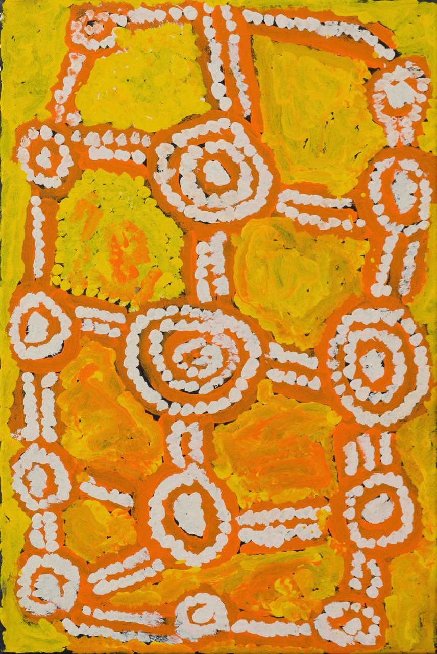 “The Wanarn paintings are accomplished with confidence and ease, over tea or television, on the verandah or in bed. The precise interpretation of the paintings coming from the painting programme, and their relationship to tjukurrpa (the Dreaming) remains obscure because they are made by people who are experiencing the end of their lives, with sensibilities far from the anxieties of life as we know it.