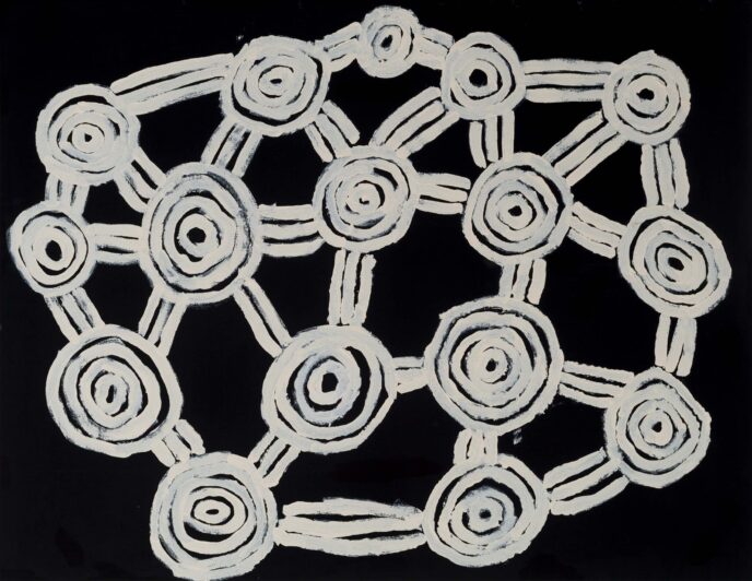 They have a quality of ‘Verschmolzenheit’, an expressive simplicity that comes to artists in old age … and they push Australia’s Western Desert painting movement, well known for its dots and circles, into sparser and wobblier forms [created] by unsteady hands with an utterly intuitive grasp of the subject.